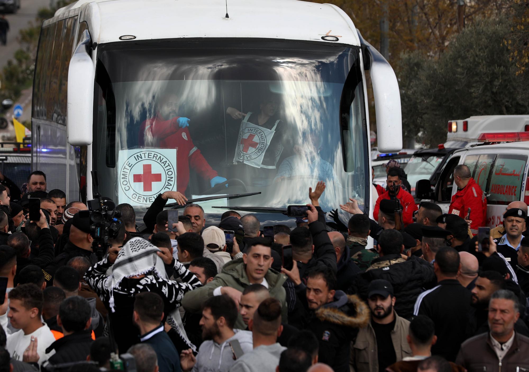 2月1日,获释的巴勒斯坦人乘坐大巴车抵达约旦河西岸城市拉姆安拉,人们前来迎接。新华社发(艾曼·诺巴尼摄)停火谈判的另一段插曲是以方可能临时“换将”。以色列媒体报道,内塔尼亚胡正考虑指派战略事务部长罗恩·德尔默取代摩萨德局长达维德·巴尔内亚,领导以方谈判团队。巴尔内亚仍是谈判团队成员。